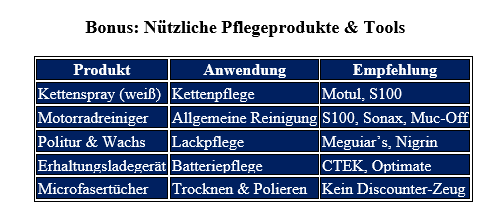 Dein Bike dankt es dir! Wer sein Motorrad regelmäßig pflegt und wartet, fährt sicherer, länger und mit mehr Stil. Egal ob Kettenpflege, Bremsencheck oder der perfekte Glanz vorm Saisonstart: Hier bekommst du alle Tipps, um dein Motorrad in Schuss zu halten.